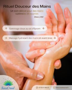 Offre fête des mères : Rituel Corps & FlottaisonPrev Offre fête des mères : Rituel Douceur des Mains35,00 € Rituel Douceur des Mains – 30 min : Un soin délicat pour des mains sublimées et nourries 🎀 Un gommage doux au sel d’Epsom Un massage hydratant des mains et avant-bras Une boisson chaude offerte dans notre espace détente quantité de Offre fête des mères : Rituel Douceur des Mains Ajouter au panier Catégorie : Modelage/Massage Description Description Produits similaires Modelage 30 minutes en duo 70,00 € Modelage/MassageAjouter au panier Modelage 45 minutes en duo 100,00 € Modelage/MassageAjouter au panier Pack de 5 massages de 30 minutes 150,00 € Modelage/MassageAjouter au panier Modelage 30 minutes « Pause détente » (8-15 ans) 25,00 € Modelage/MassageAjouter au panier