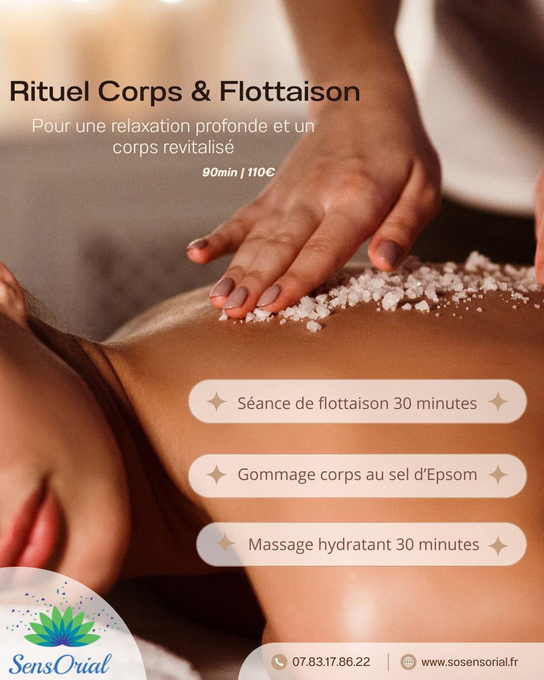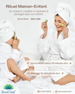 Modelage 1h30 en duoPrev Offre fête des mères : Rituel Corps & FlottaisonSuivante Offre fête des mères : Rituel Maman-Enfant90,00 € Rituel Maman-Enfant – 60 min : Un moment complice et apaisant à partager avec son enfant 💕 Une séance de flottaison de 30 minutes en duo Un massage de 30 minutes en duo Une boisson chaude offerte dans notre espace détente De 8 à 15 ans quantité de Offre fête des mères : Rituel Maman-Enfant Ajouter au panier Catégories : Flottaison, Modelage/Massage, Modelage/Massage Description Description Produits similaires Modelage dans l’eau de 30 minutes 65,00 € Flottaison,Modelage/MassageAjouter au panier Pack de 3 séances de flottaison 30 minutes 105,00 € FlottaisonAjouter au panier Séance de flottaison (30 minutes) + modelage (30 minutes) 70,00 € Flottaison,Modelage/MassageAjouter au panier Modelage dans l’eau de 45 minutes 85,00 € Flottaison,Modelage/MassageAjouter au panier