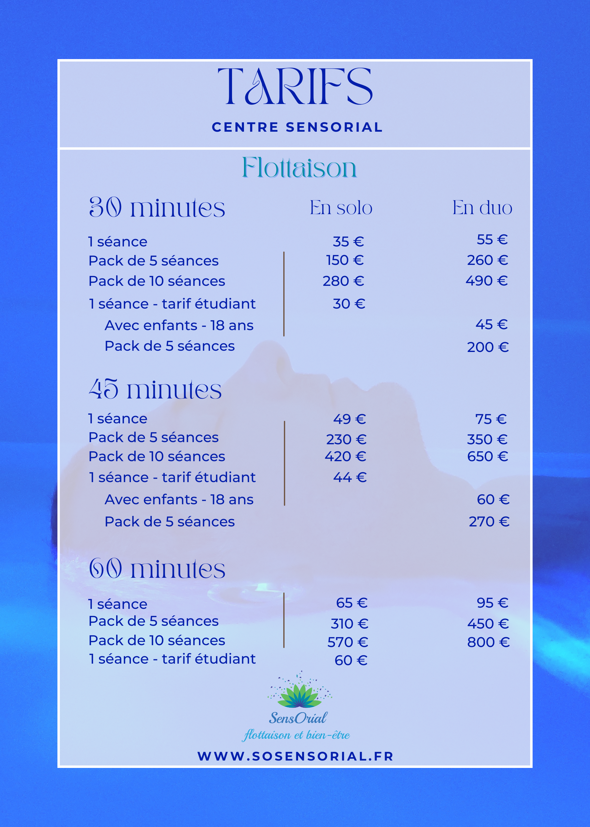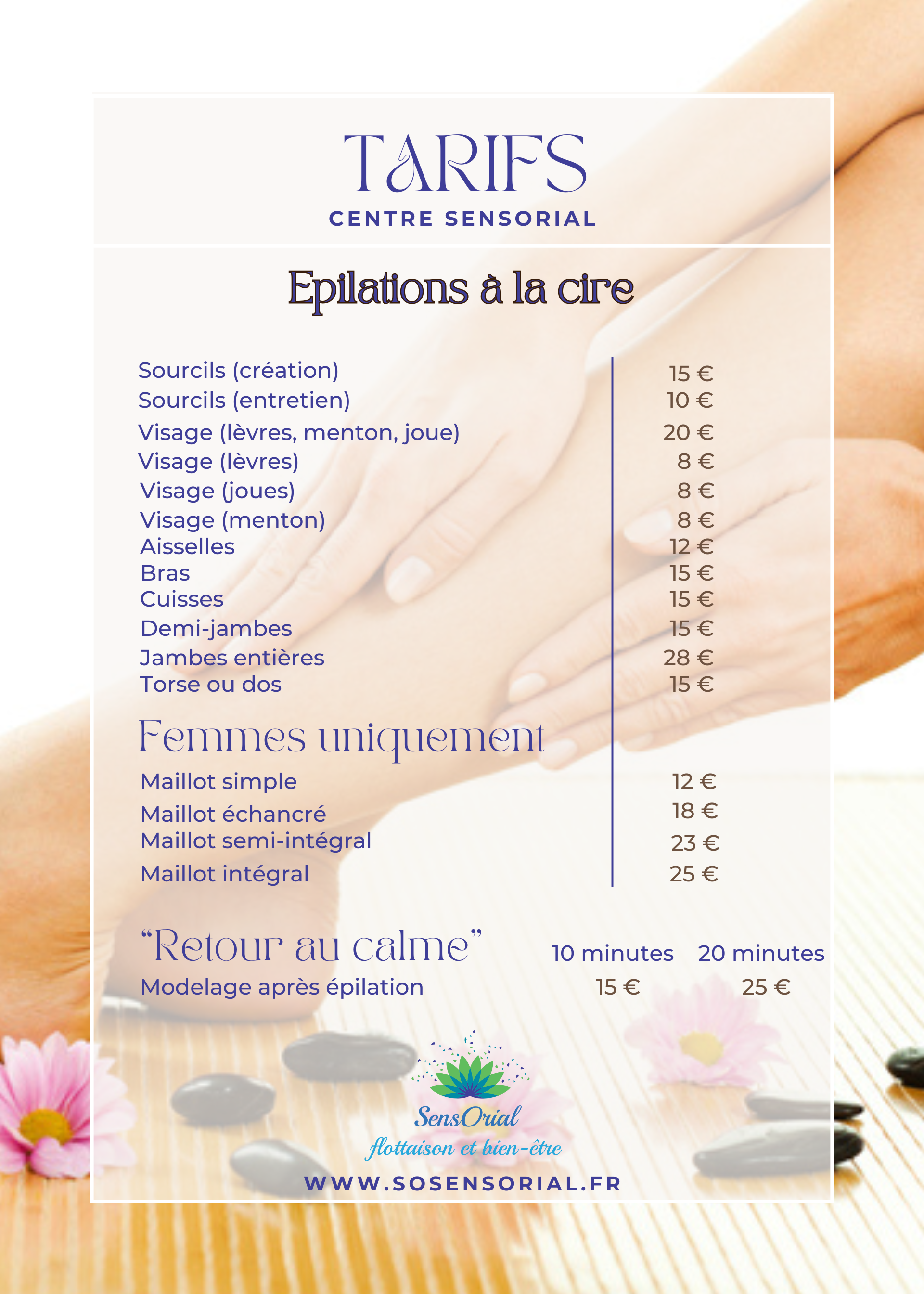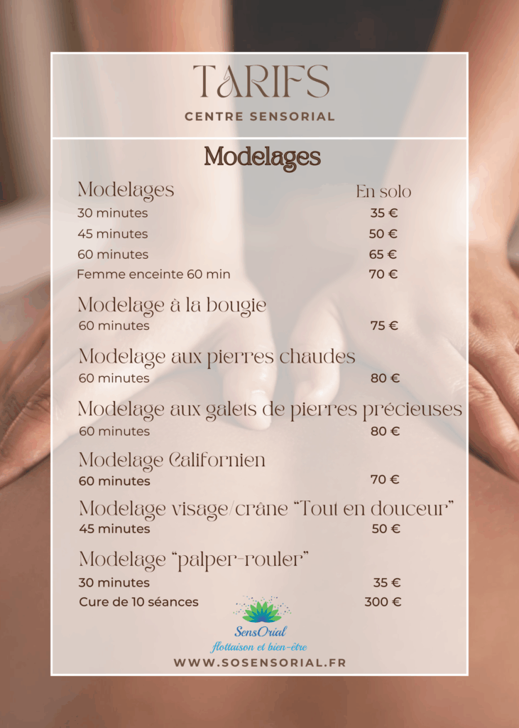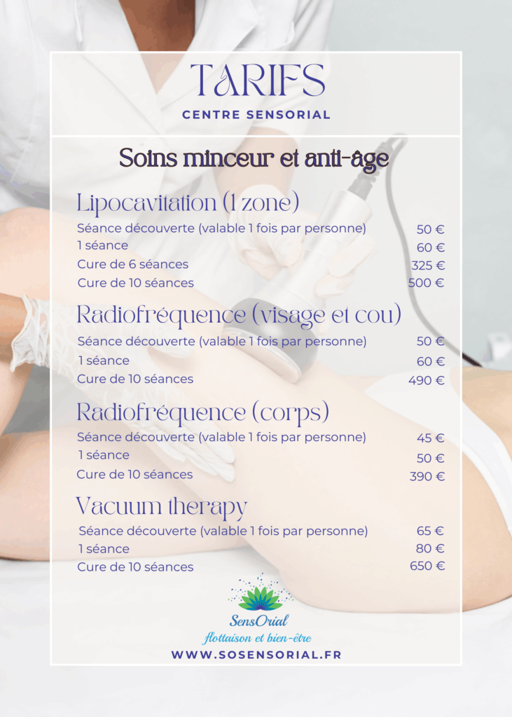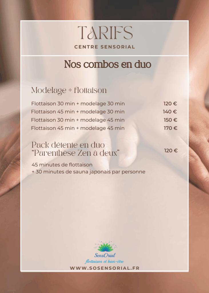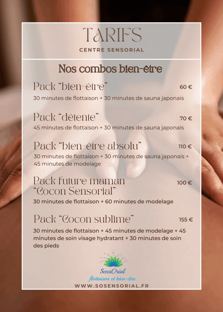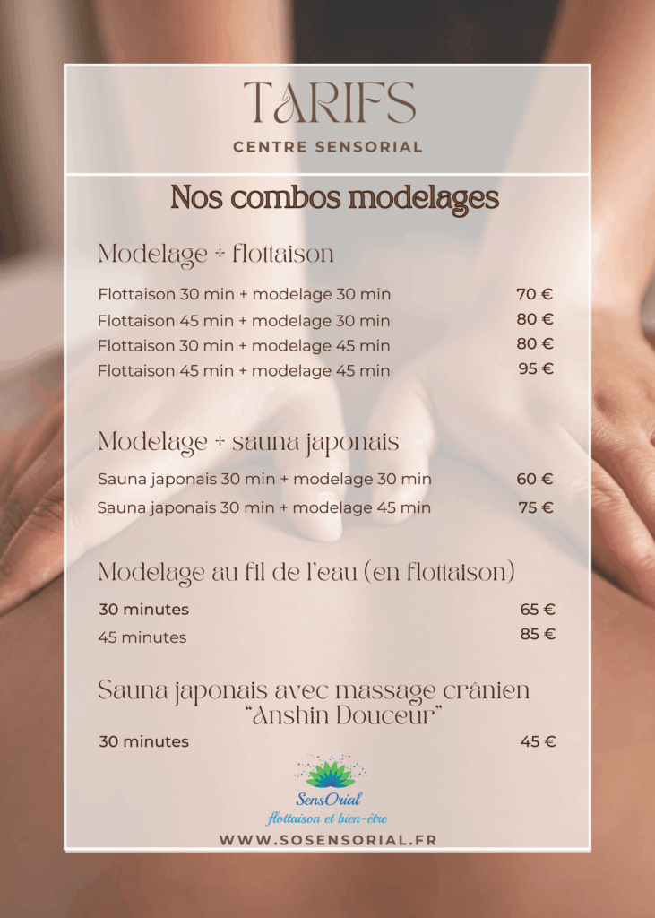 Prendre rendez-vous . FlottaisonSauna japonaisModelagesCombos modelagesCombos bien-êtreCombos en duoSpécial enfantSoins esthétiquesEpilationsMinceur et anti-âgeCombos Minceur et anti-âge